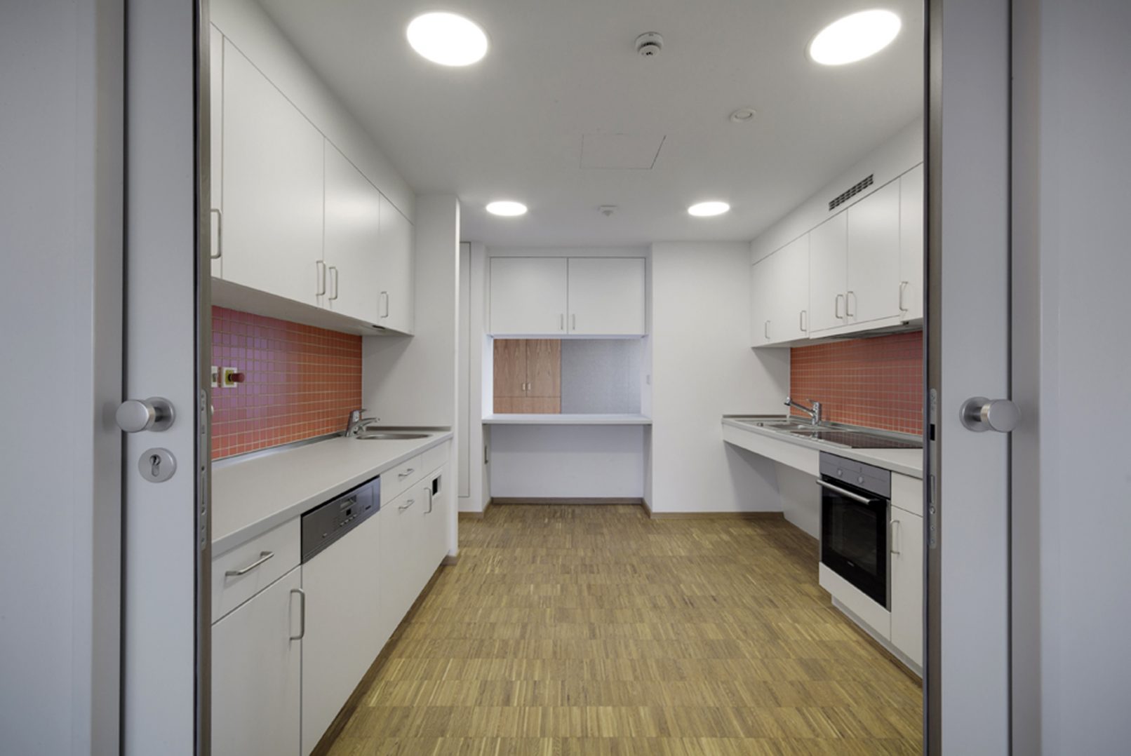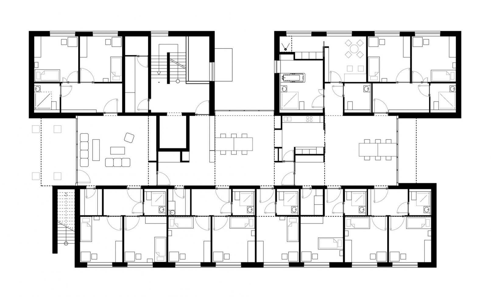 Pro Etage sind je 12 Bewohnerzimmer als eine Wohngruppe organisiert. Zwei Bewohner teilen sich in der Regel ein Bad, 4 Bäder sind zusätzlich für Rollstuhlfahrer ausgelegt. Durch den Verzicht auf Flure als reine Verkehrsflächen, werden die gemeinschaftlich genutzten Bereiche – trotz eng gesteckter Flächenvorgaben des Fördergebers – großzügig und flexibel nutzbar.