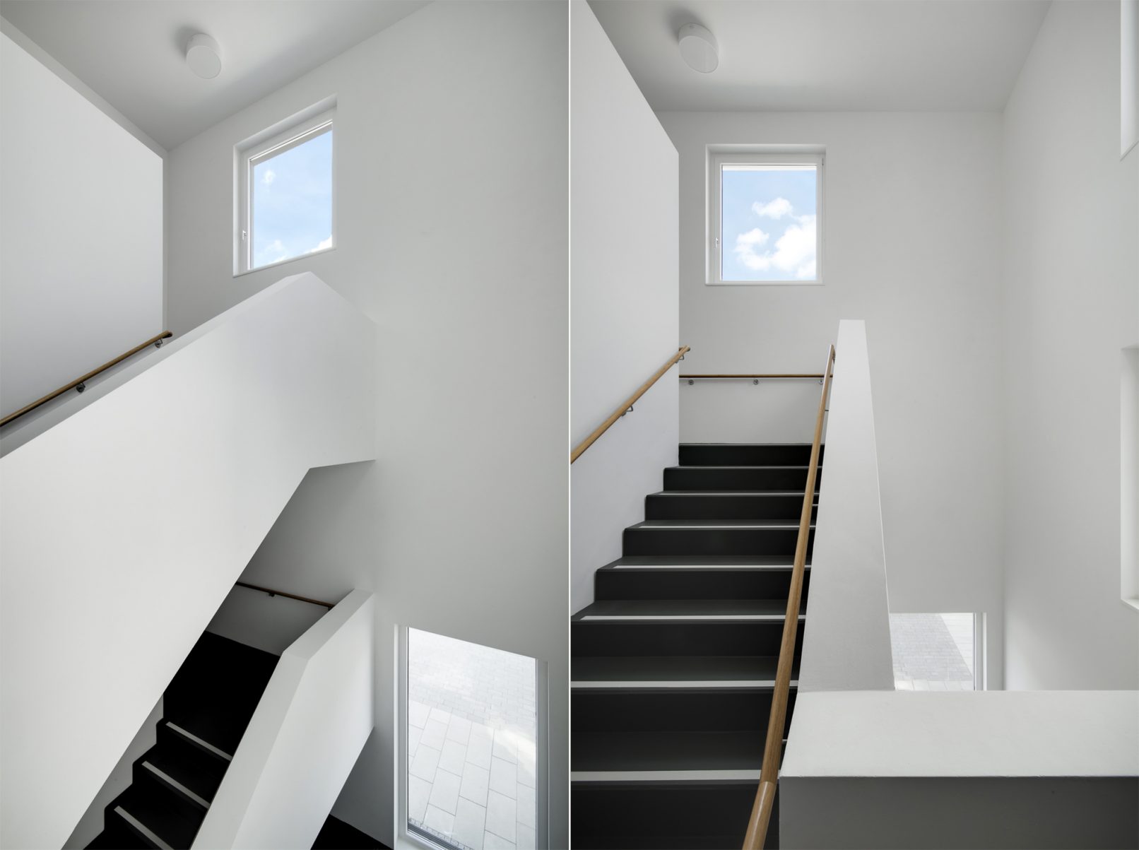 Der Haupteingang befindet sich im Sockelgeschoss. Das Gebäude ist komplett barrierefrei konzipiert.