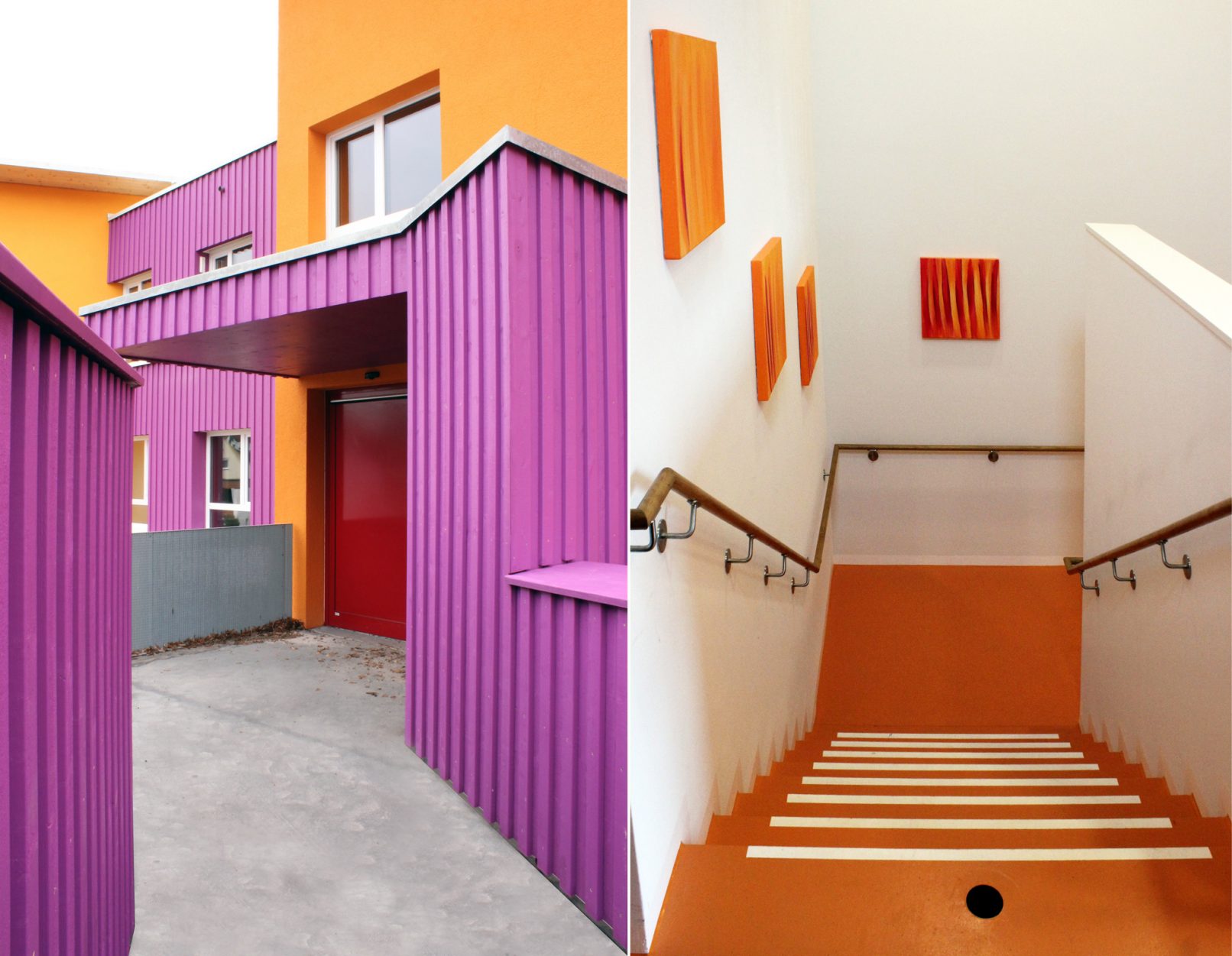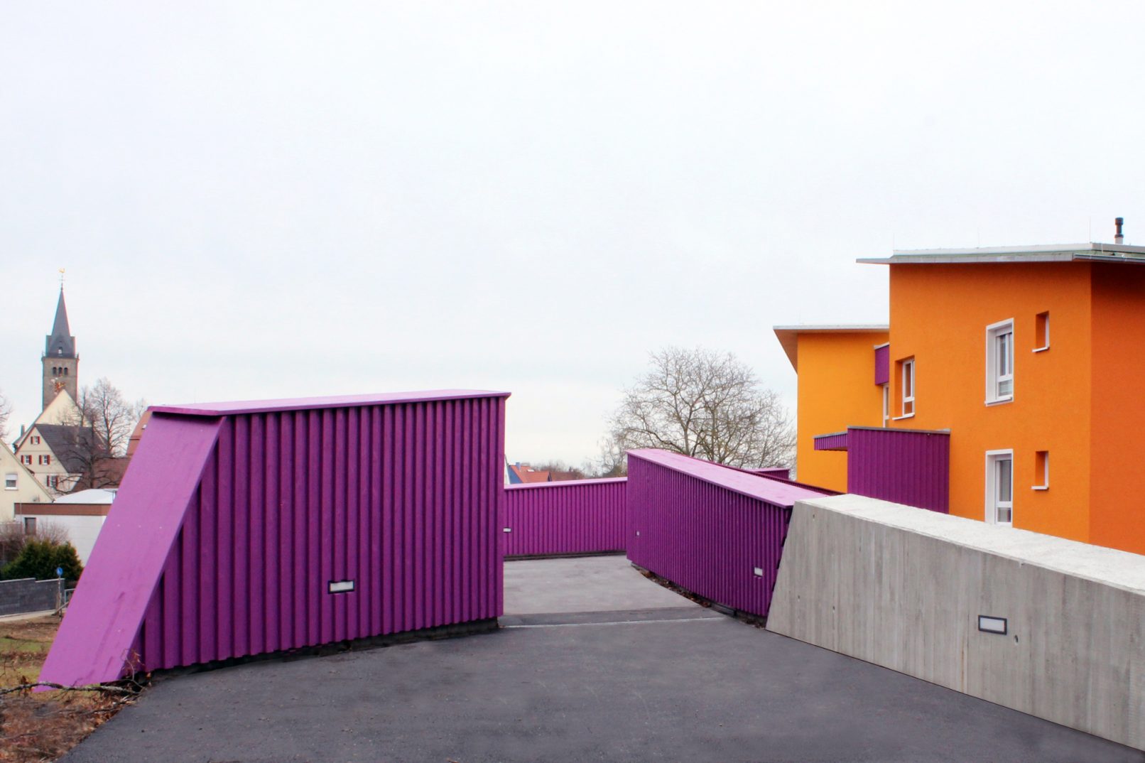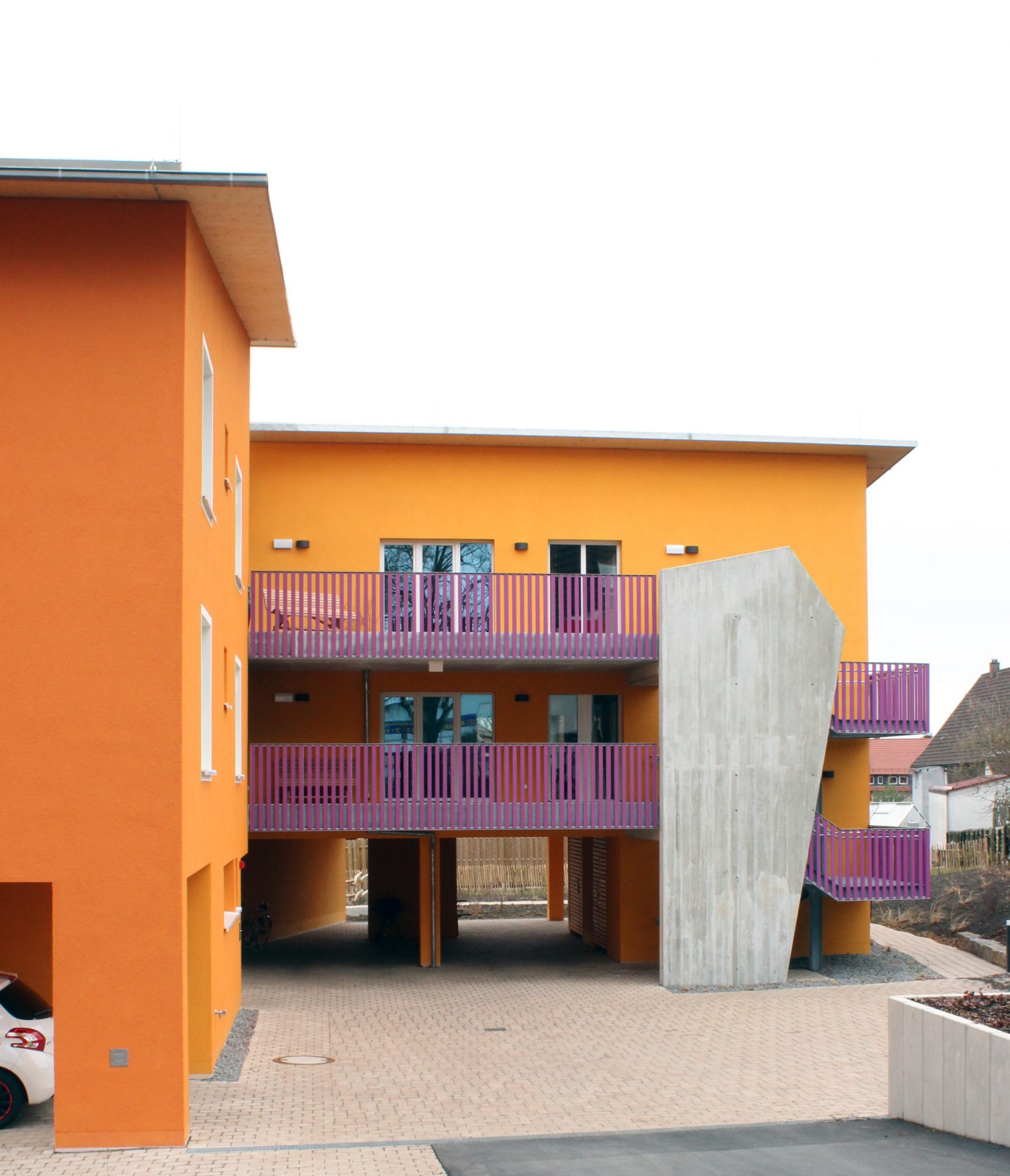 Das neue Haus für insgesamt 24 Menschen mit Behinderung gibt mit seiner zentralen Lage nahe der Ortsmitte von Welzheim Antwort auf das Inklusionskonzept der Laufenmühle. Der trotz anspruchsvoller Topographie barrierefreie Eingang erfolgt über die ebenfalls von mha entworfene ‚Kunstbrücke‘ ins Erdgeschoss. Sie ist markantes Wahrzeichen des Wohngruppenhauses und steht gleichzeitig symbolisch für das „Brückenbauen“ zwischen behinderten und nicht behinderten Menschen. Ein anfahrbarer Nebeneingang liegt im Gartengeschoss des Gebäudes, in welchem sich neben einer zum Garten orientierten 4 Zimmer-Wohnung auch die Neben- und Technikräume befinden.