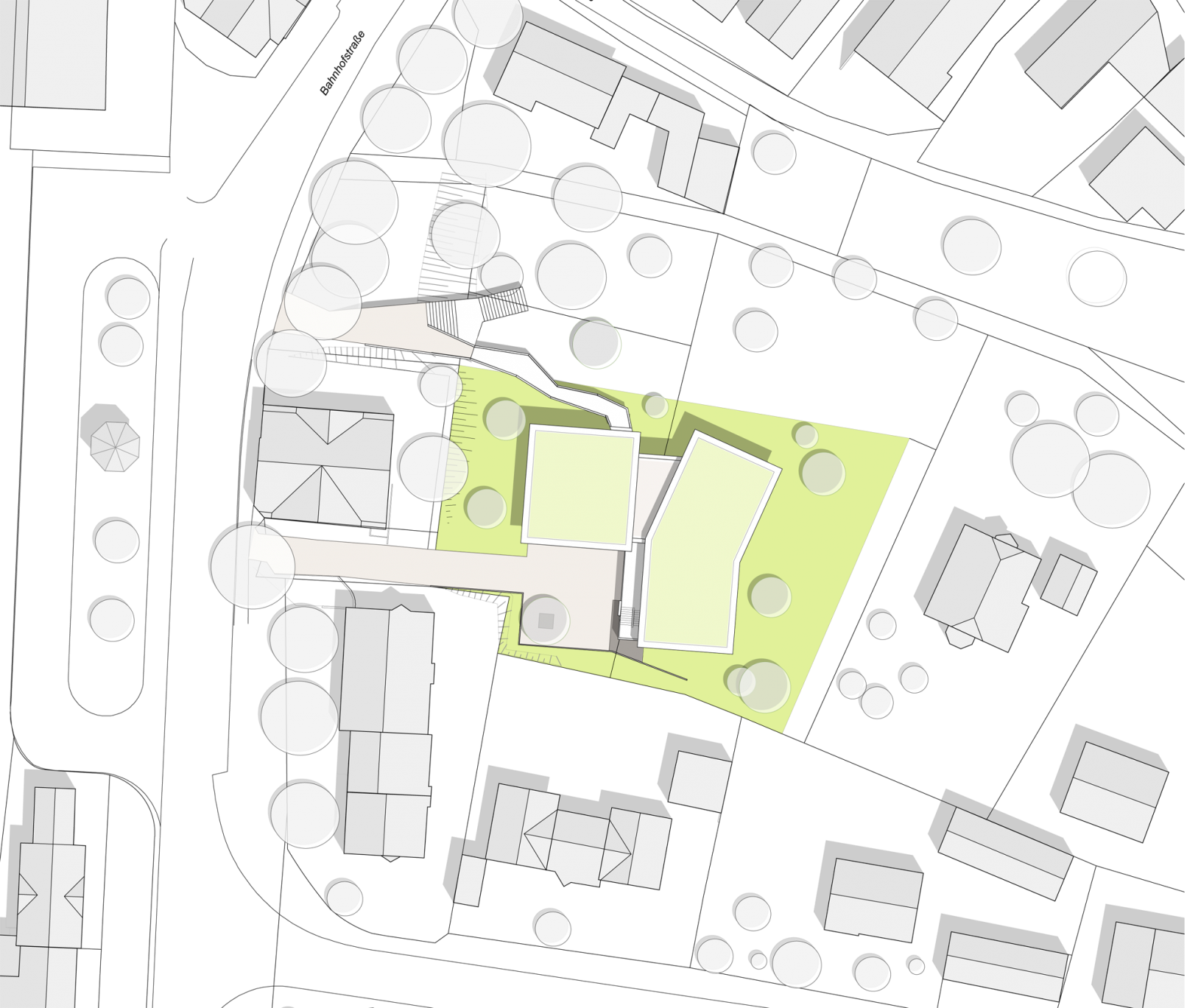 Das Haus selbst besteht aus zwei Hauptbaukörpern, die über eine Gebäudefuge verbunden sind, in welcher sich die Gemeinschaftsräume befinden. Die beiden Hauptbaukörper nehmen die Bezüge und die Körnigkeit der umgebenden Bebauung auf. Sie haben ein flach geneigtes, leicht auskragendes Dach, während sich die Gebäudefuge mit Flachdach nach Süden zu Balkonen und einer in den Garten führenden Treppe auflöst.