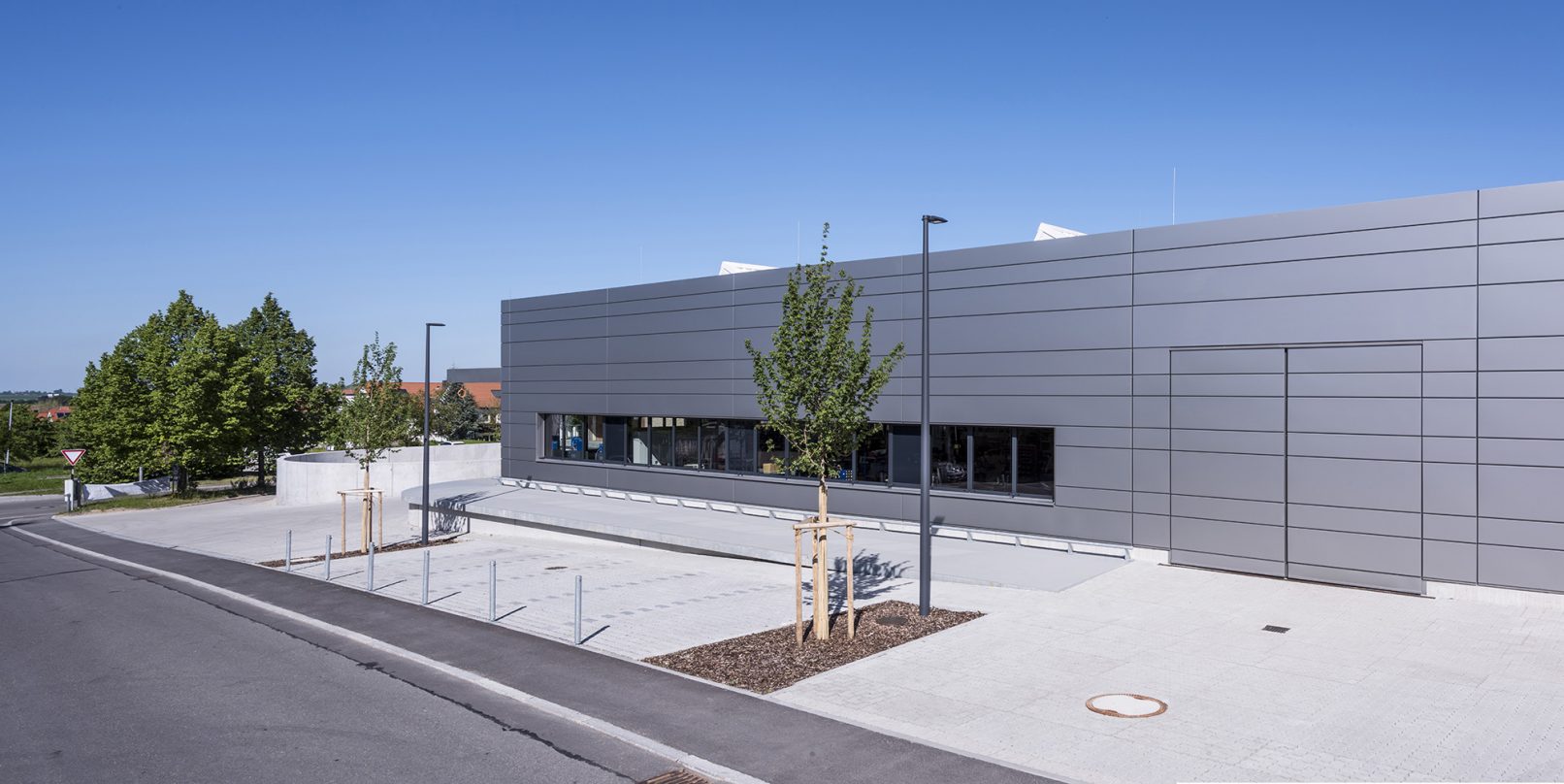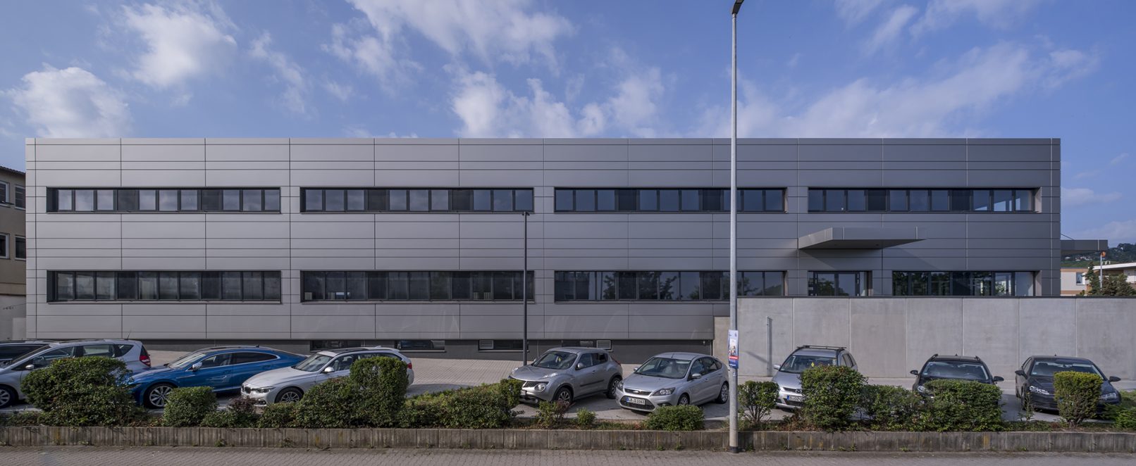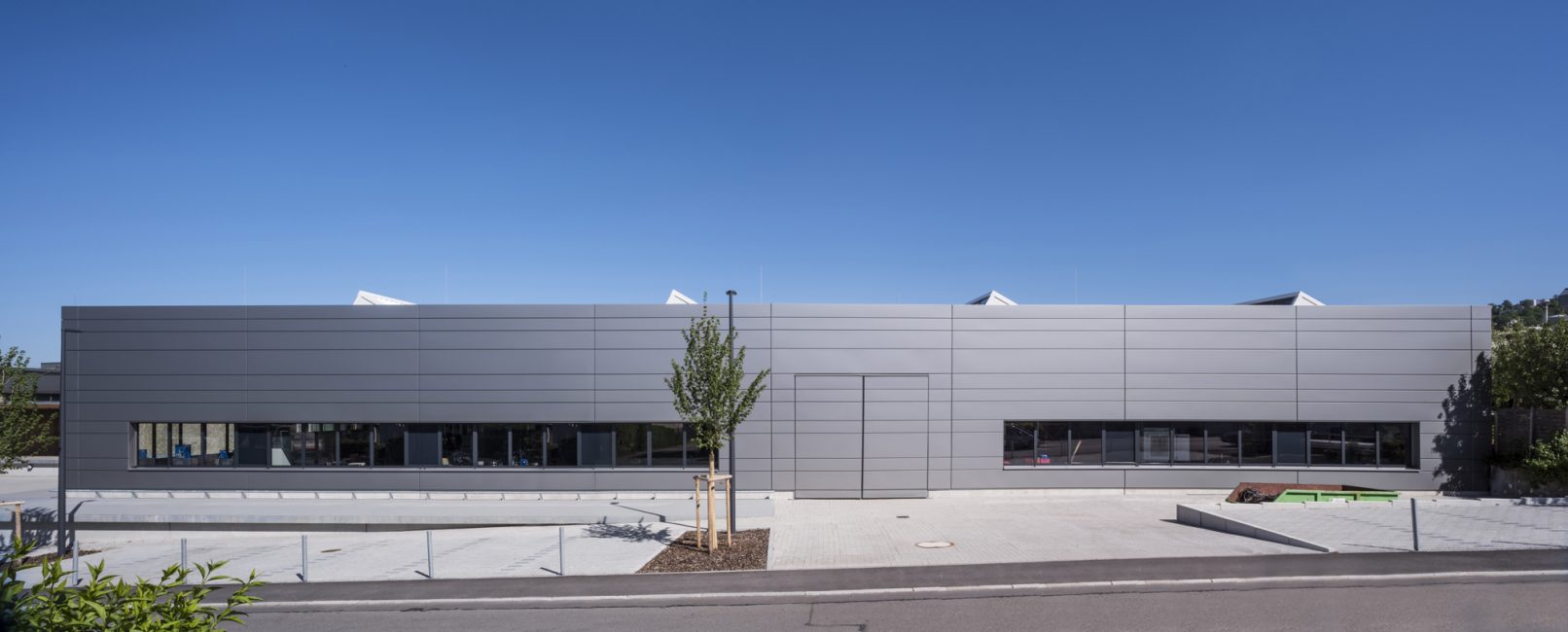 Im 1. Bauabschnitt 2016 wurde auf einer Freifläche des Geländes eine neue Produktionshalle mit Messraum errichtet. Die Ausrichtung des Gebäudes orientiert sich am Grundstück, das nach Norden abfällt. Dort verbindet sich der Neubau über eine Laderampe mit der Bestandshalle. Da die Halle im Osten und Süden direkt an Bestandsgebäude angebaut ist, wurden Öffnungen nur entlang der Westseite sowie zum Zugang Richtung Norden eingebracht. Die Hauptbelichtung der Halle erfolgt über Oberlichter. Der Skelettbau wurde aus Betonfertigteilen errichtet, die als konstruktive Bauteile ablesbar bleiben. Die Fassade aus beschichtetem Stahlblech wurde mit Profilen in verschiedenen Deckbreiten ausgeführt. Das lebendige Fassadenbild hebt sich so bewusst von der Industriearchitektur der Nachbarschaft ab und zeigt die hochwertige Arbeit der Firma auch nach außen.