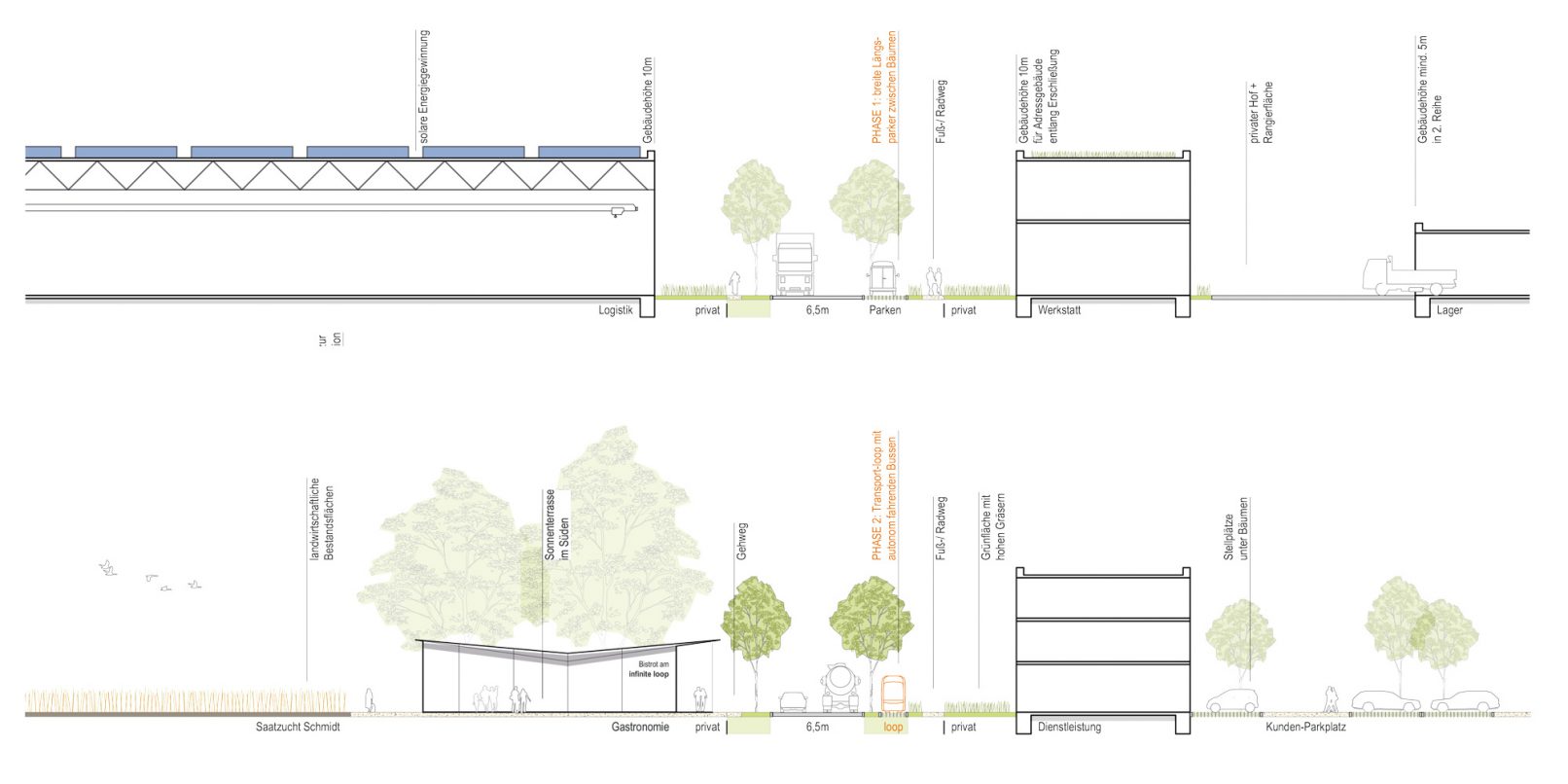 Als zukunftsweisendes Mobilitätskonzept werden autonom fahrende E-Kleinbusse vorgeschlagen. Diese fahren entlang des neuen GRÜNEN LOOPS und des bestehenden Erschließungsring im westlich angrenzenden Gebiet, bilden so den großen Doppel LOOP ab und definieren diesen mit einem zukunftsweisenden Transportmittel. Der GRÜNE LOOP auf dem „PatchWork Campus“ mit dem hohen und kräftigen Baumkranz ermöglicht außerdem mit sorgfältig platzierten baulichen Hochpunkten eine gute Orientierung – von der Autobahn aus aber auch von den umgebenden Stadt- und Landschaftsräumen.