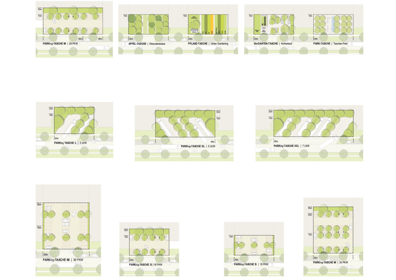 Grundidee für die orthogonale Struktur sind die landwirtschaftlichen Felder – dieses Raster-“Feld“ basiert auf den Programmvorgaben für die Grundstücksgrößen und ist Grundlage für das vorgeschlagene Bebauungskonzept mit verschiedenen Bausteinen. Das kleinste Modul beträgt 15m – vielfache Breiten sind möglich und können gut kombiniert werden, da die gesamte Matrix auf dem Raster basiert und sich sogar Baumreihen und -abstände einfügen. Neben den Grundstücken in modularer Größe erhält das Rasterfeld sogenannte „Patches“ – dies sind grüne Taschen mit unterschiedlichen Nutzungen: PARK-Tasche, PARKing-Tasche, GARTEN-Tasche, Bier-GARTEN-Tasche oder Apfel-Tasche, uvm. – das Konzept gibt damit in einem vorgegebenen, aber flexiblen Rahmen Möglichkeiten zur individuellen Gestaltung des Stadt- und Freiraums.