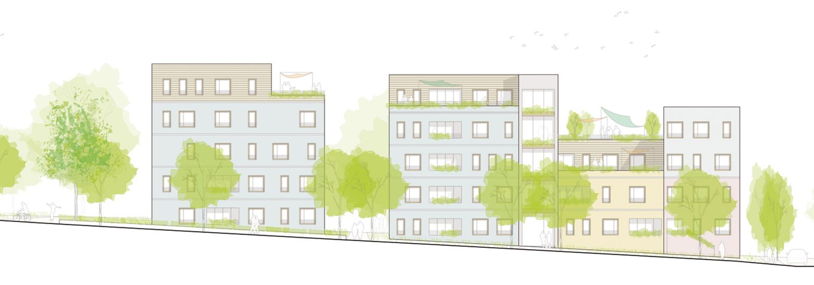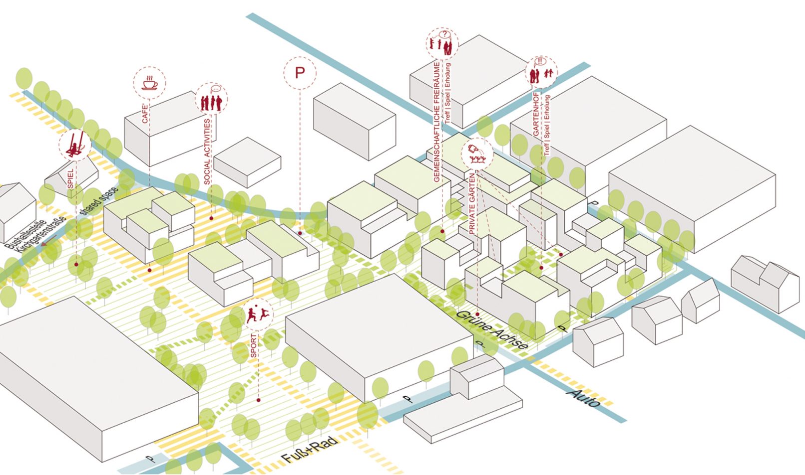 Aus der aufgelösten Blockstruktur werden miteinander verwandte Gebäudetypologien für die sozialen Nutzungen und für das Familienwohnen entwickelt. Sie unterschieden sich, bilden aber zusammen eine Familie. Ein besonderes Merkmal ist das vielseitige Angebot von unterschiedlich nutzbaren gemeinschaftlichen und privaten Freiräumen.