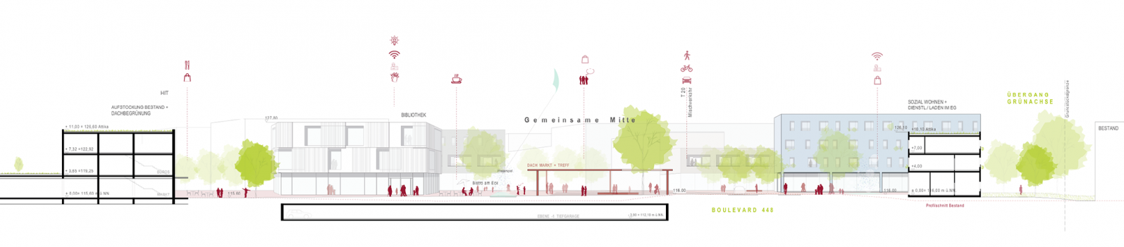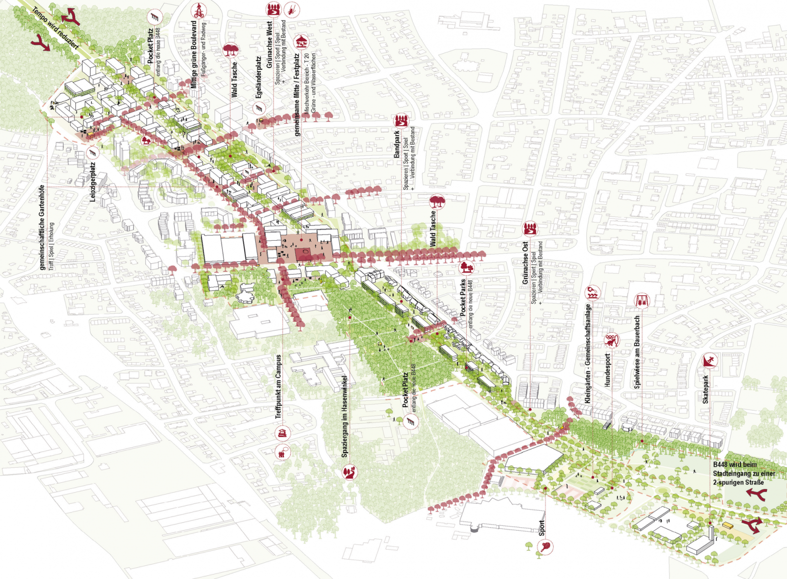Unser Konzept beinhaltet die Ausbildung eines multifunktionalen Bewegungsraums in Form eines Stadtboulevards mit unterschiedlich gestalteten Sequenzen zwischen zwei unterschiedlich interpretierten Stadteingängen. Angelagert an den Bewegungsraum werden 4 unterschiedliche Stadtbausteine für die verschiedenen Wohntypologien entwickelt. Der neue Bewegungsraum 448 wird mit einem Schwerpunkt für die aktive Mobilität wie Fuß- und Radverkehr entwickelt, attraktive Querungen, Verknüpfungen und qualitätvolle Plätze markieren die wichtigen Verbindungen. Grüne Freiräume, Retentionszonen und extensive Freiraum-Nutzungen vernetzen die bisher isolierten Bereiche wie auch den Stadtwald miteinander.