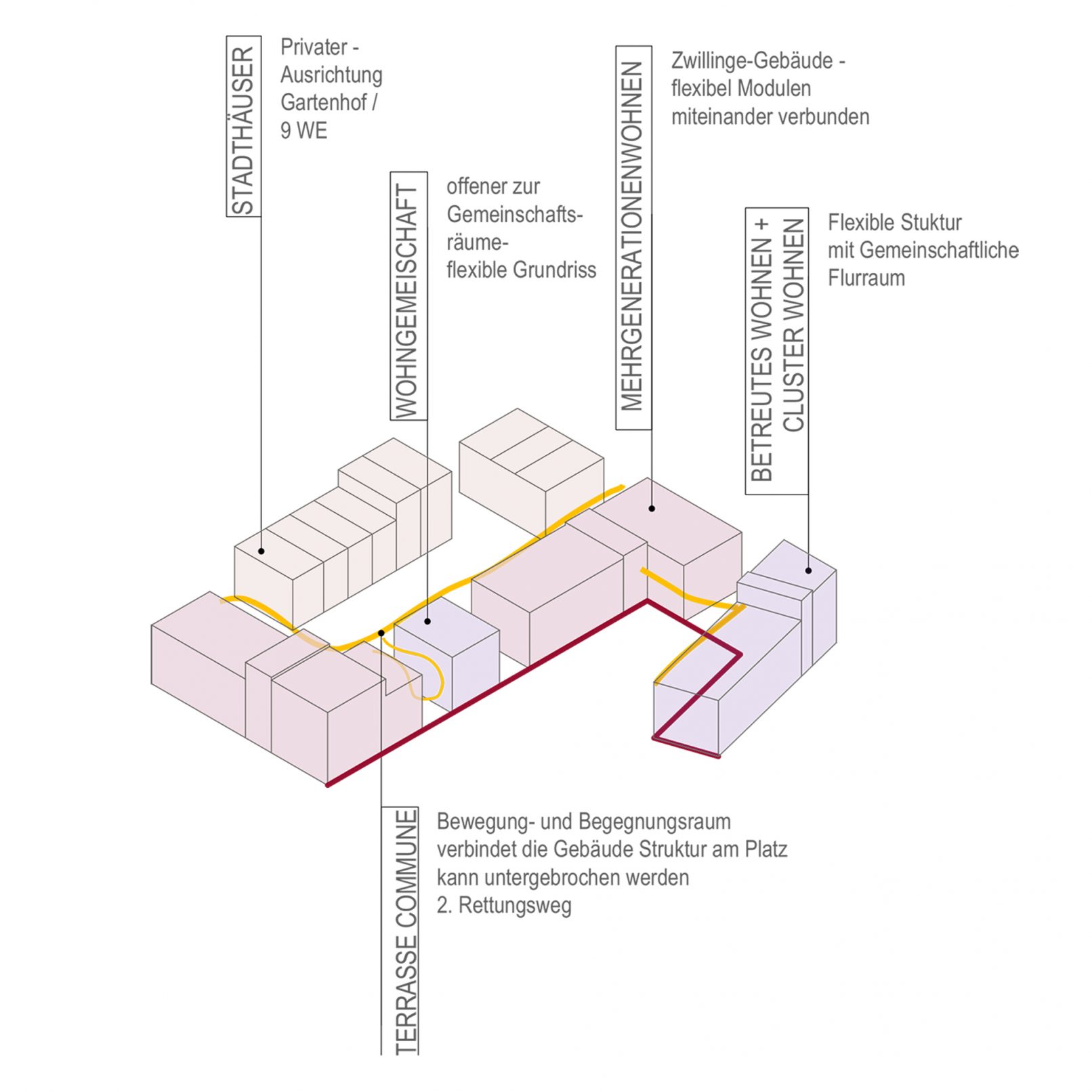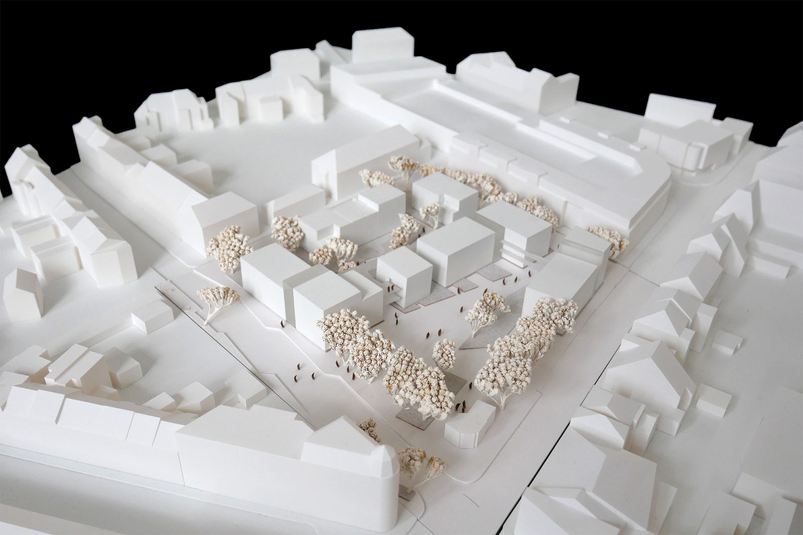 Für die Bebauung wird eine Mäander-Struktur aus ähnlichen Bausteinen vorgeschlagen, welche den mit Platanen eingerahmten Platzraum überlagert. Wo notwendig werden bauliche Raumkanten gebildet, welche den historischen Baumrahmen aufbrechen, ohne die seit langem bestehende Platzkonfiguration ‚Am Röttgen‘ auszulöschen.