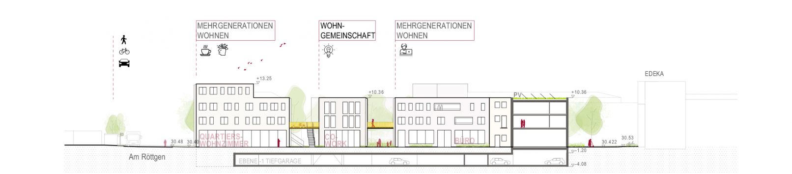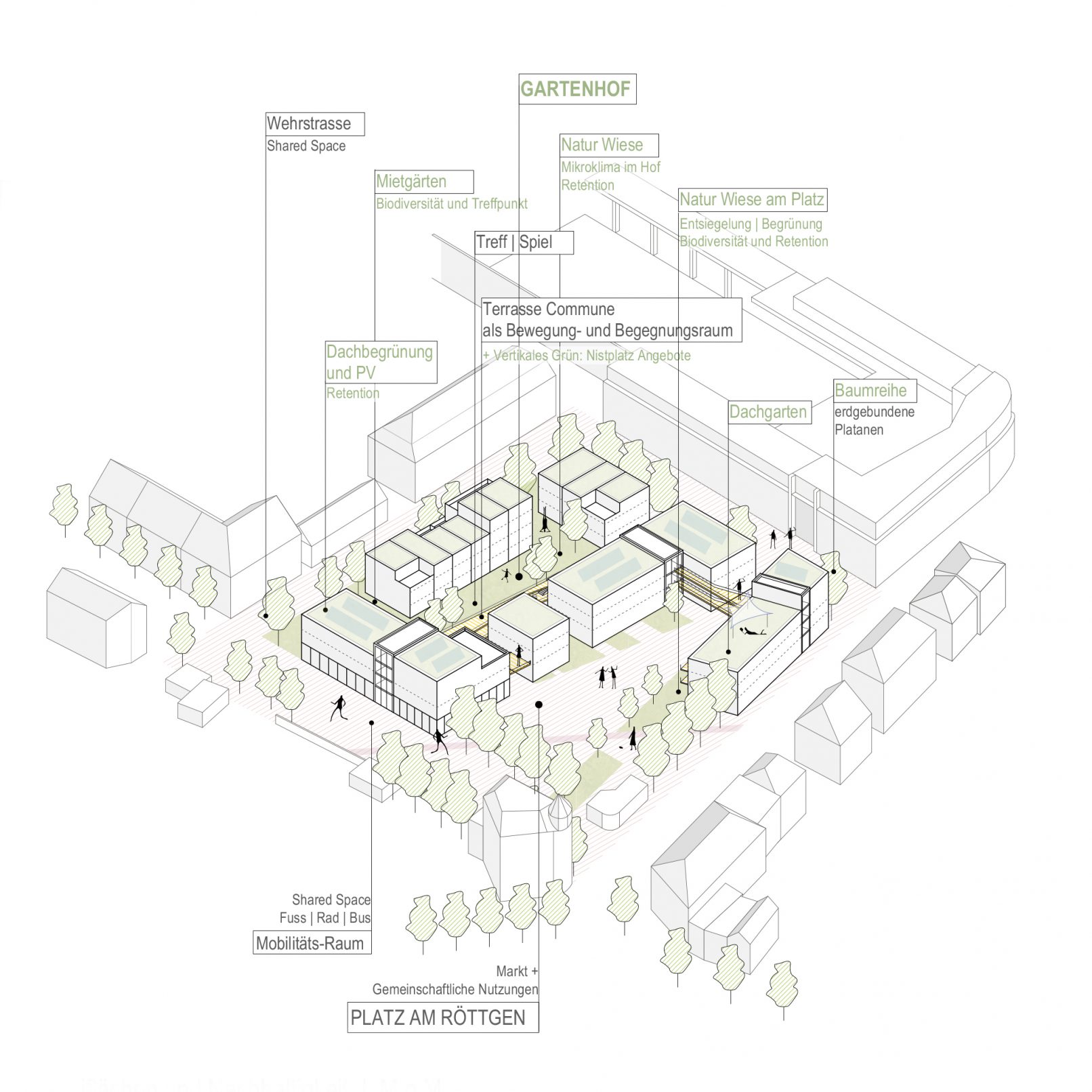 Mit dem mäandrierenden Gebäude-Ensemble werden auf der Platzfläche zwei sehr unterschiedliche Freiräume ausgebildet: ein gemeinschaftlicher Gartenhof für das neue urbane Quartier und ein öffentlicher Platzraum, der neue ‚Platz Am Röttgen‘, welcher sich zum ehemaligen Stadttor und zur historischen Kernstadt orientiert.