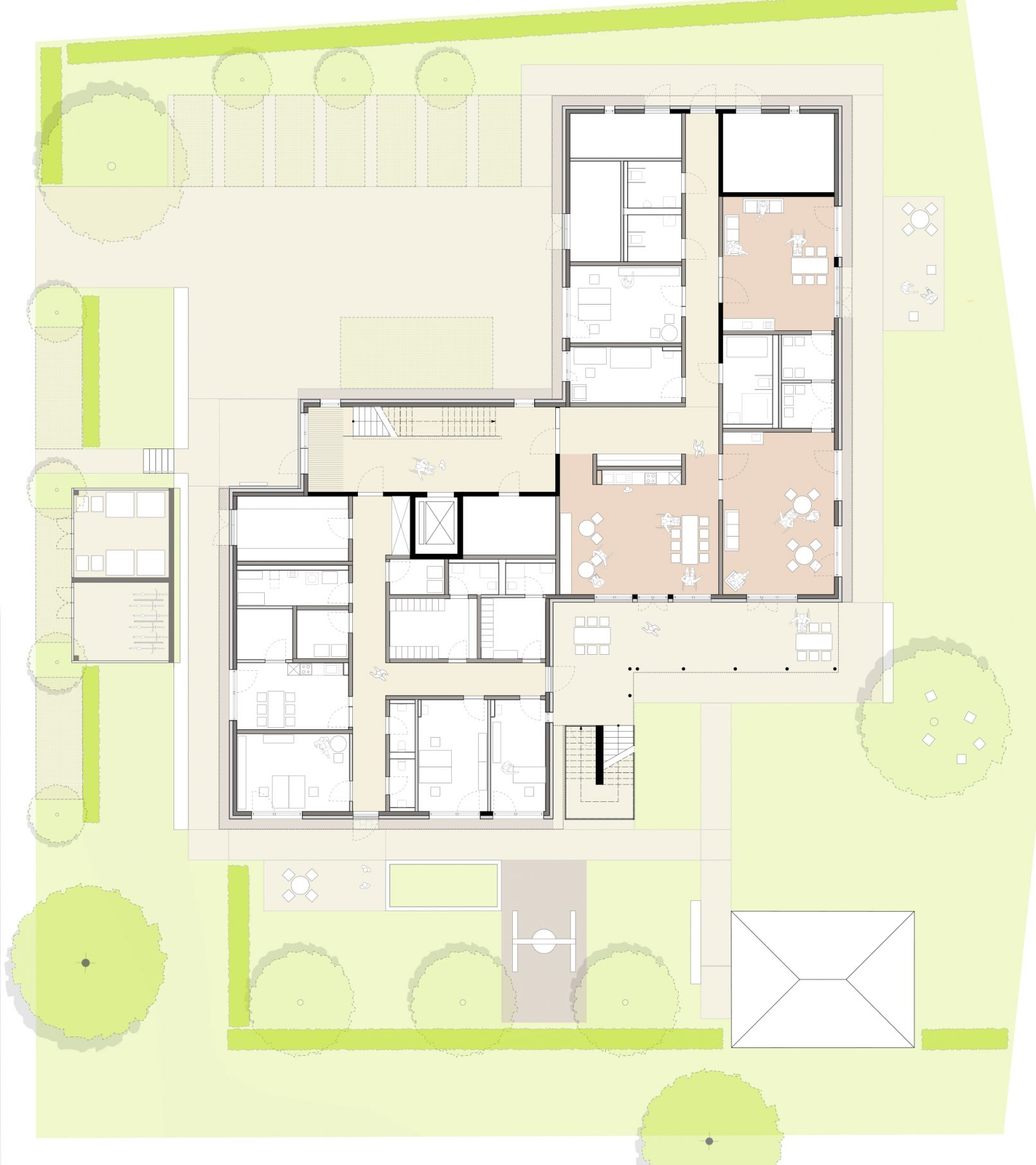 In Neuenstadt am Kocher im Dahenbachtal entsteht ein neues Wohnheim mit Tagesstruktur auf dem Gelände eines ehemaligen Gaswerks. Das dreistöckige Gebäude bietet in den beiden oberen Geschossen Wohnraum für 28 Menschen mit Teilhabeeinschränkung. Im Erdgeschoss befindet sich eine Tagesstruktur für zwei Gruppen mit direktem Zugang zum Garten, sowie der Verwaltungsbereich.